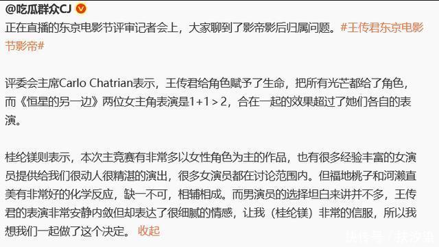随着争议持续发酵,细心网友发现网络传言中存在诸多漏洞。首先, 东京电影节绝非单个评委能操控 。本届电影节评审团由五位成员组成,即使导演文晏真的受到“沪圈”的压力,她也只是五分之一的声音。